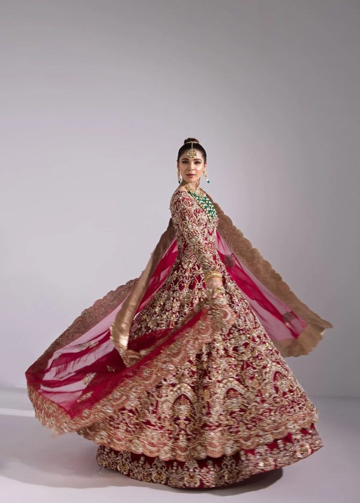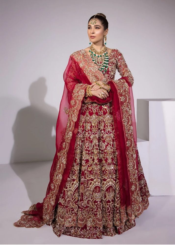The lehenga is traditionally paired with a long shirt or choli, while a heavily embellished dupatta completes the regal silhouette. Popular color choices include traditional reds, maroons, golds, and deep jewel tones, while modern bridal designs also incorporate soft pastels and contemporary color blends for a refined aesthetic.