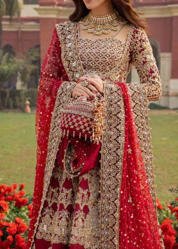 Red Pakistani Bridal Pishwas Lehenga is a breathtaking bridal ensemble,