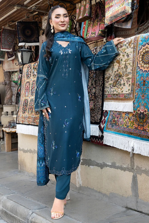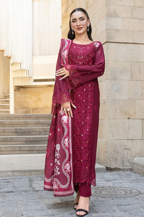 ECA-1258 Luxury Linen Embroidered 3D Suit with Printed Shawl & Trousers – USA Collection